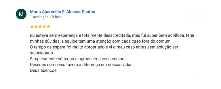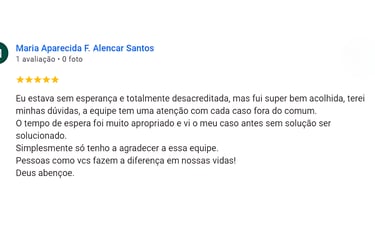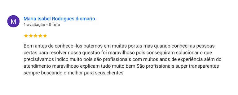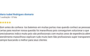 Bom antes de conhece -los batemos em muitas portas mas quando conheci as pessoas certas para resolver nossa questão foi maravilhoso pois conseguiram solucionar o que precisávamos indico muito pois são profissionais com muitos anos de experiência além do atendimento maravilhoso explicam tudo muito bem São profissionais super transparentes sempre buscando o melhor para seus clientes
