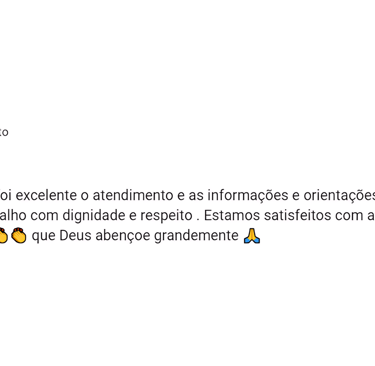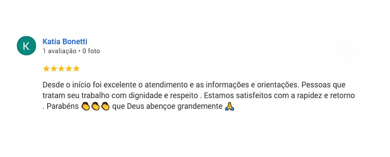 Desde o início foi excelente o atendimento e as informações e orientações. Pessoas que tratam seu trabalho com dignidade e respeito . Estamos satisfeitos com a rapidez e retorno . Parabéns 👏👏👏 que Deus abençoe grandemente 🙏